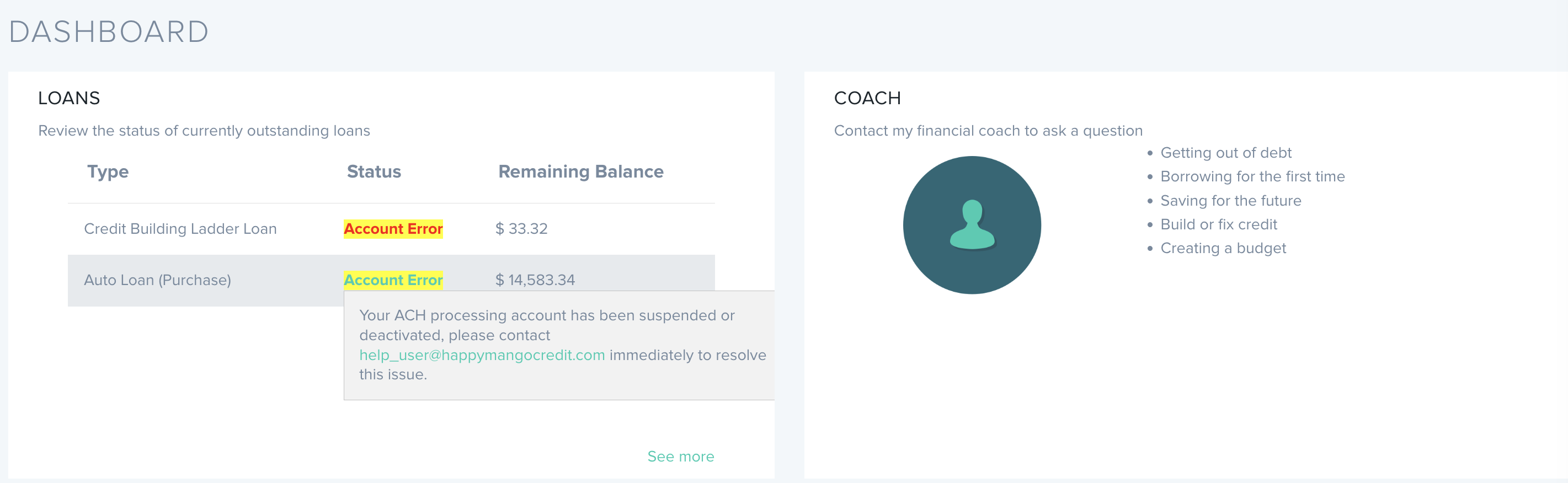 You should contact our support team immediately upon seeing the "Account Error" flag on your Dashboard and Loans page or receiving an email with the following heading "Account Suspended/Deactivated for Payment Functions on Happy Mango." The email and the appearance of the "Account Error" alert happen automatically and concurrently when our system receives a notice from our ACH payment processor that they have deactivated or suspended your payment account.